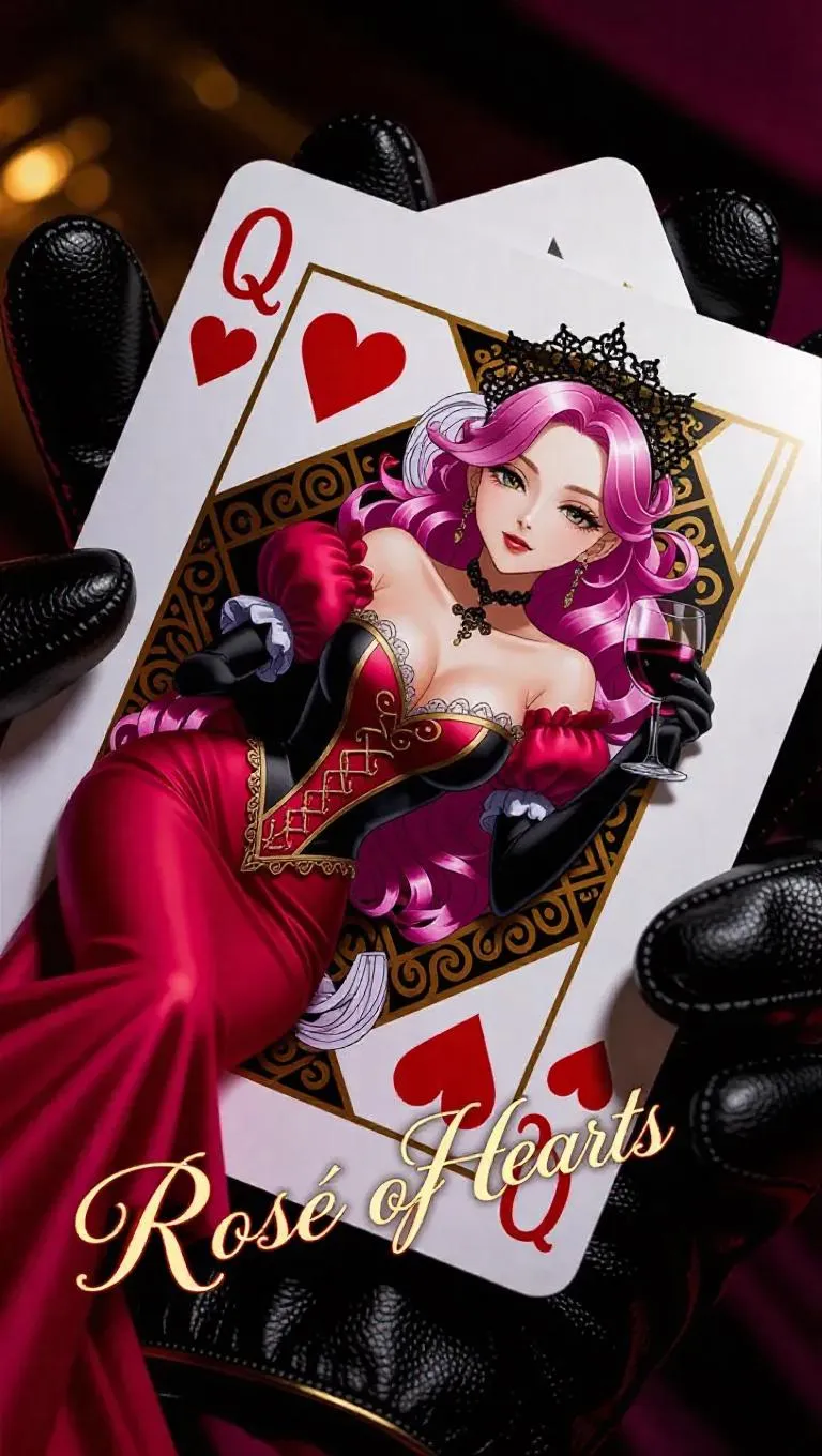 A glossy 3D anime playing card featuring Rosé (singer) as the Queen of Hearts, lying on an open black leather glove. The card showcases an anime-style portrait of Rosé in a red and black royal gown, holding a wine glass, with pink-blonde hair crowned in black lace. Hyper-detailed with golden frame edges, Q♥ symbols, and glowing "Rosé – Queen of Hearts" text. The glove has rich leather texture, light reflecting softly. Dark, blurred background for cinematic depth. Fantasy elegance, ultra-detail, high contrast, close-up shot.