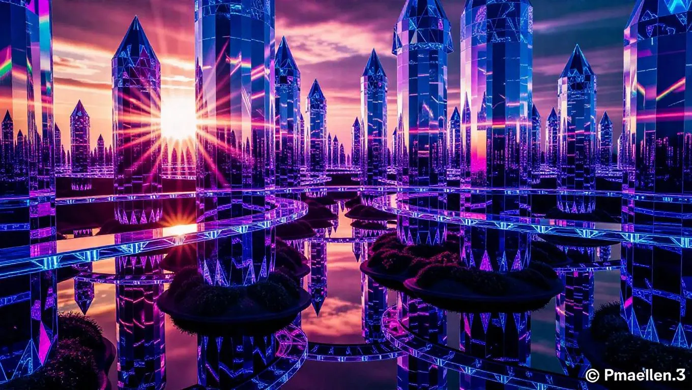 Discover AI-generated futuristic cities with luminous crystal architecture, cyberpunk neon aesthetics, and prismatic rainbow refractions. Explore hyper-detailed, bioluminescent metropolises featuring geometric crystal spires, glassy canals, and cinematic volumetric lighting. Create mesmerizing cyberpunk-fantasy landscapes blending translucent textures, ethereal glows, and vibrant color-shifting effects through advanced AI image generation tools for stunning visual storytelling.