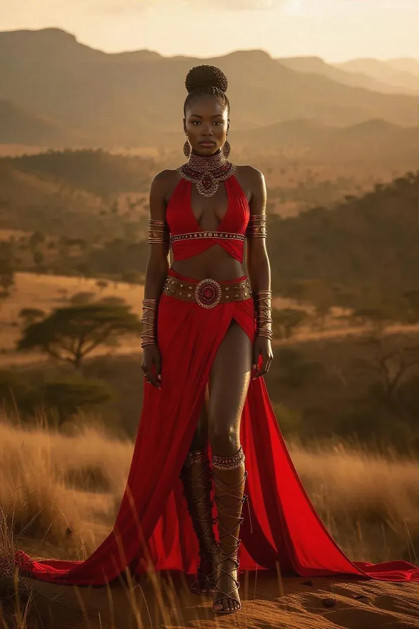 Generate stunning AI visuals of a black woman in a vibrant African-inspired fantasy dress with red hues, high slit, gladiator sandals, and hand straps. Explore AI-powered image creation against a majestic African plateau backdrop, blending cultural aesthetics with cutting-edge AI effects for professional-grade artistic results.