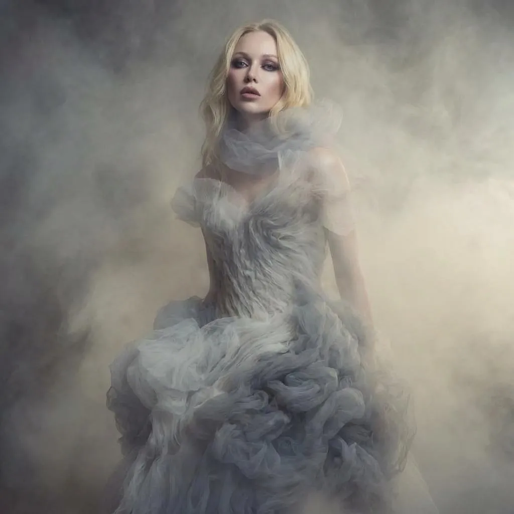 get inspired with first picture and create different one with using model face on the second picture, make it look different, foggy and dreamy effect
