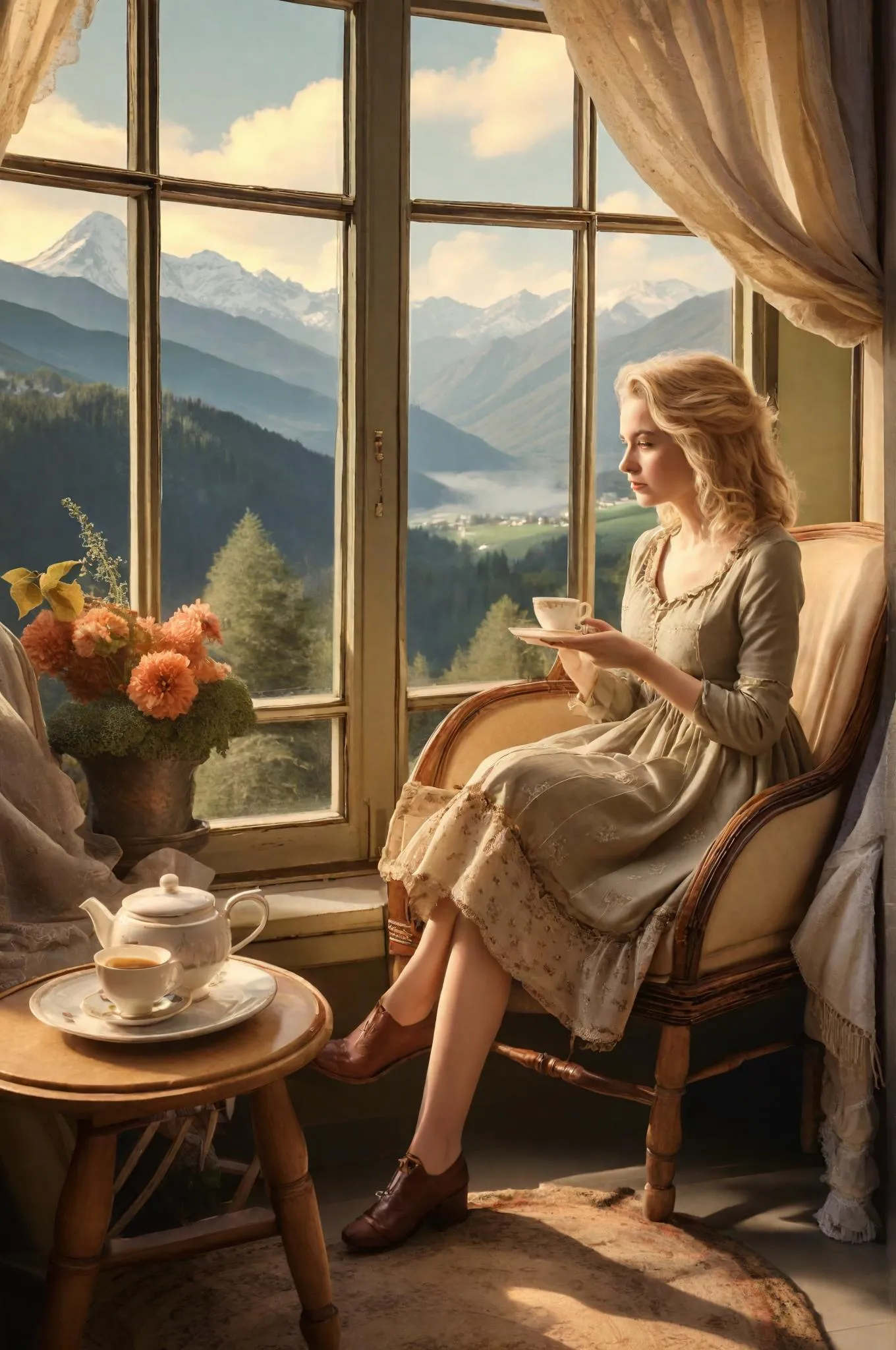 Transform text into captivating visuals with VivaGo.ai's AI image generator. Create a full-body portrait of a young blonde woman with curly hair, dressed in a traditional frock, sipping tea by a window in a vintage mountain house. Capture rustic charm, cozy atmosphere, and intricate vintage decor details effortlessly.