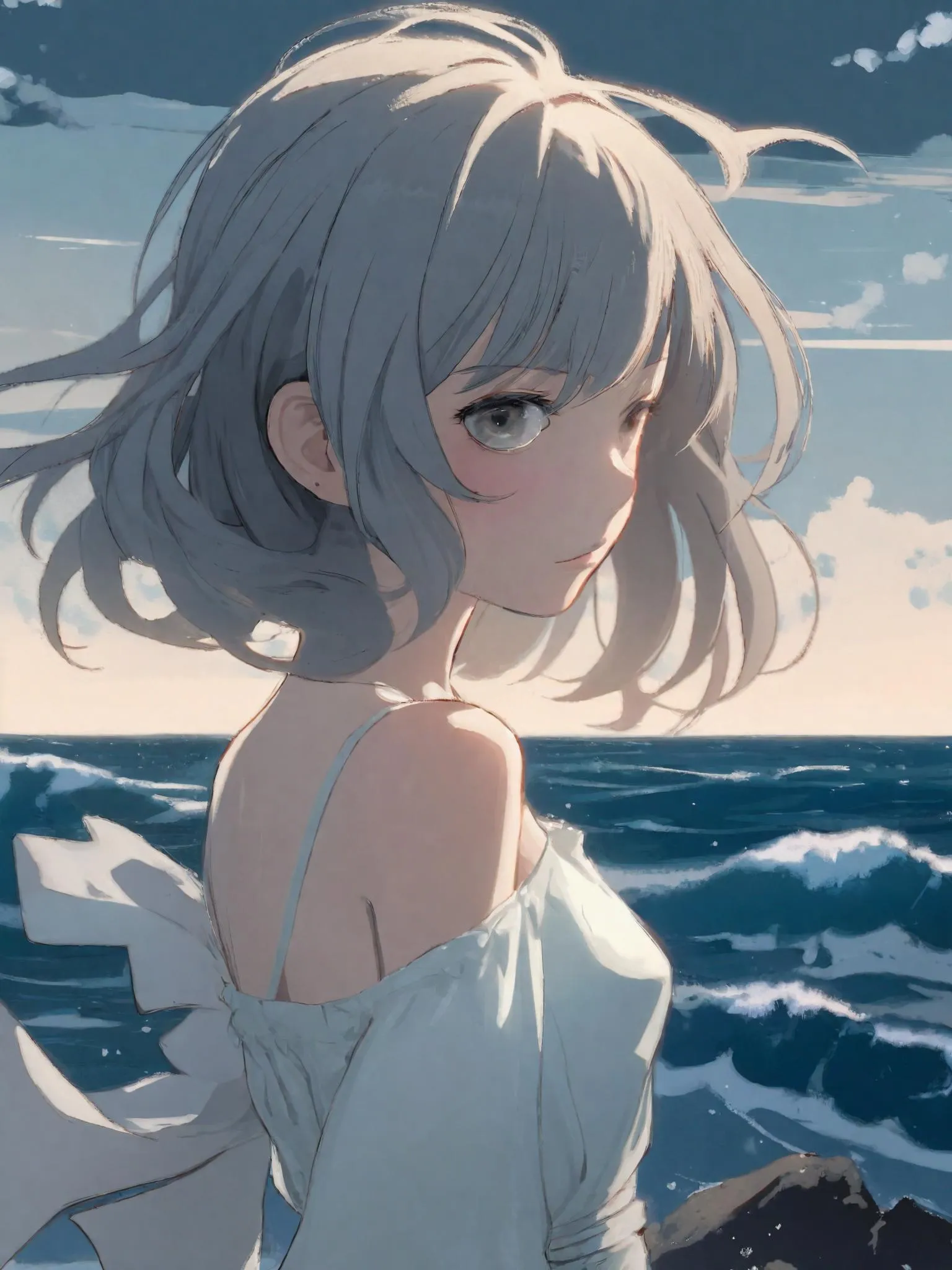 Create a serene summer beach scene with AI-generated anime art. Craft a shy, short-haired girl in a delicate swimsuit, gazing away as soft waves and glowing horizons frame her vulnerable grace. Perfect for anime enthusiasts—transform text into visuals with VivaGo's AI tools for ethereal, lifelike summer moments.