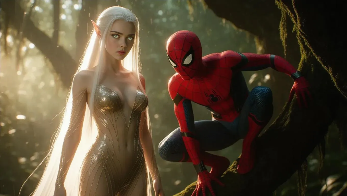 An elven girl with long white hair and glowing skin stands in a mystical forest, her sheer, see-through dress flowing around her hourglass figure. Her green eyes shimmer under soft ambient light. Beside her, Spider-Man crouches heroically on a mossy tree branch, his red-and-blue suit gleaming with rain-kissed highlights. The forest pulses with ethereal magic, illuminated by faint bioluminescence. The atmosphere feels otherworldly, sensual, and enchanted. High contrast, fantasy art style, ultra-detailed, film grain, 8K resolution. Cinematic wide shot, camera glides slowly sideways.
