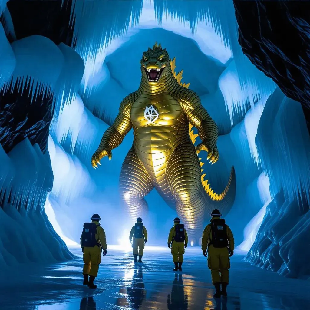 Transform your vision into vivid AI-generated art: a colossal golden Godzilla statue towers in an icy cave, surrounded by intricate ice patterns and explorers in yellow suits. Create stunning contrasts of scale and light with text-to-image AI tools, blending mythical grandeur with dynamic exploration scenes. Perfect for fantasy visuals and professional-grade digital artistry.