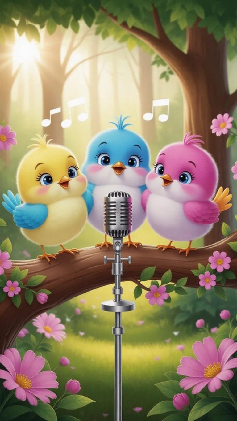Create a vibrant AI-generated cartoon scene with three fluffy singing birds on a branch, featuring a vintage mic, glowing forest backdrop, and blooming pink flowers. Perfect for whimsical children's content with magical charm, soft sunlight, and cheerful colorful characters in a fantastical woodland setting.