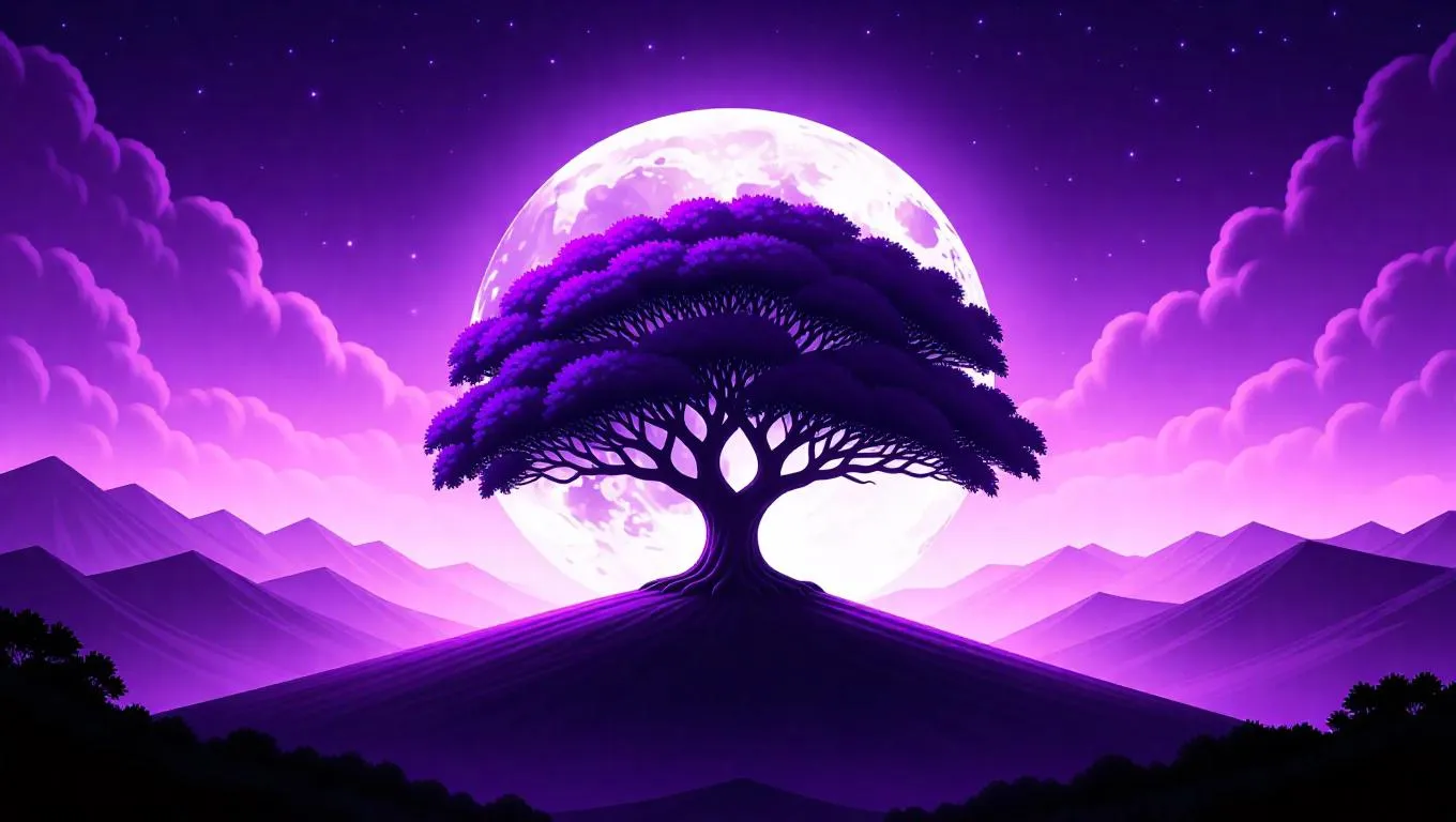 Generate a serene fantasy landscape with vivago.ai: AI-crafted purple tree on a moonlit hill, starry dark purple sky, and ethereal ambiance. Transform text into dreamy, peaceful visuals using professional AI image tools for enchanting, otherworldly scenes.