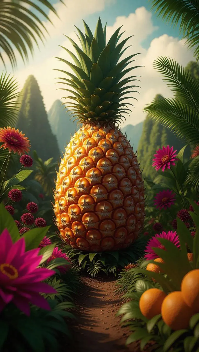 Towering pineapple-shaped volcanoes erupting with golden syrup, surrounded by a lush, overripe landscape where everything grows too fast, too sweet, too strange. Vibrant fruit-birds sing harmonious chords, causing the plants to change colors with each note, creating a surreal, enchanted atmosphere.