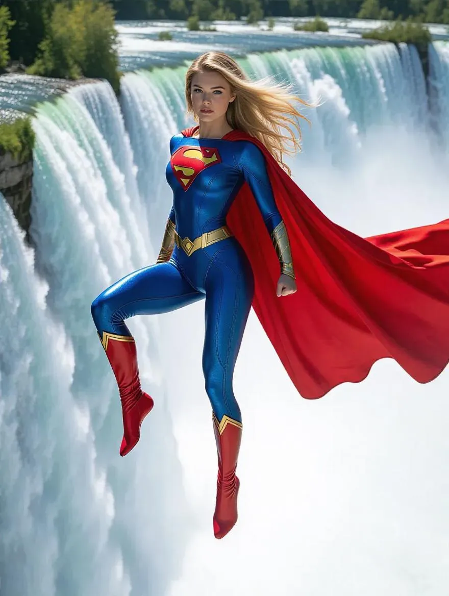 China Supergirl, blonde long hair, dressed in a red and blue leotard uniform with a long red cape and red knee-high boots, flies gracefully over Niagara Falls. 4K HDR 60fps, 360-degree display captures her full-body appearance from far to near, emphasizing her heroic silhouette against the cascading water and mist.