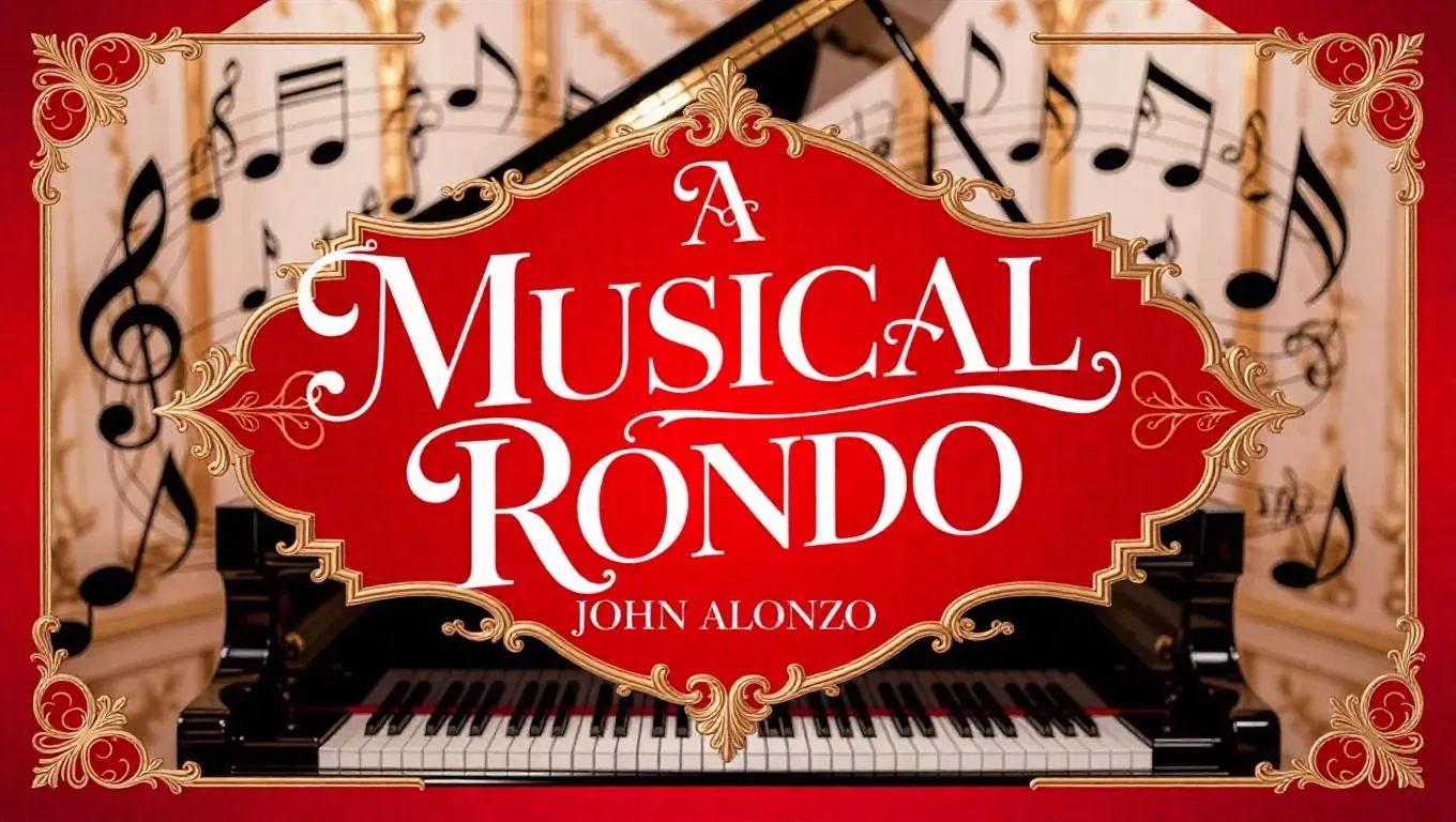 **"A Musical Rondo" by John Alonzo** Mozart-inspired grandeur meets modern artistry. Bold red and gold accents frame ornate Baroque motifs, swirling sheet music, and a quill poised over parchment. Your title gleams in gilded serif, while your name shines regally below. A subtle silhouette of Mozart overlooks a grand piano, blending timeless elegance with your creative vision. Perfect harmony of classical opulence and contemporary flair. 🎹✨