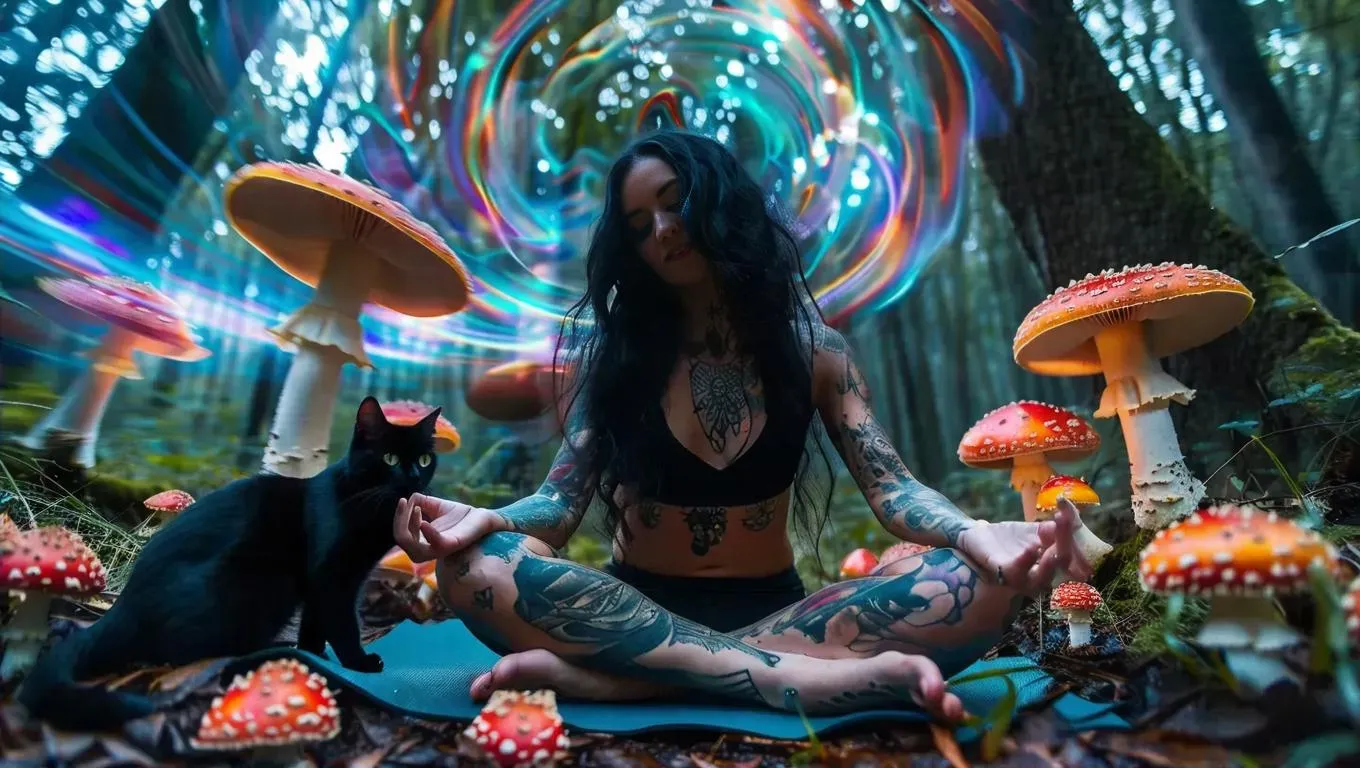 Transform text into vivid AI-generated visuals with vivago.ai: A tattooed woman in a psychedelic forest performs yoga under pulsating psytrance beats. Glowing mushrooms, swirling kaleidoscope colors, and a black cat amplify this surreal night scene. Dynamic motion effects and professional editing tools bring energy, depth, and vibrant details to your creative vision.