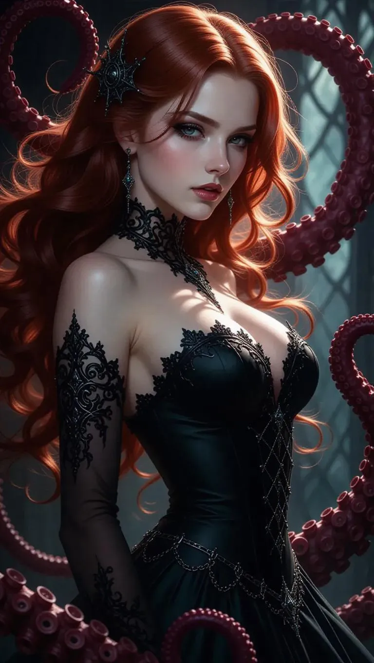 A powerful woman, embodying a mythic sea creature, with flowing red hair cascading down her shoulders, contrasted by dark, menacing tentacles wrapping around her. Soft lighting highlights her skin, creating dramatic shadows. Her intricate gothic dress, adorned with silver chains and lace, adds depth. Darkly romantic and mysterious, with themes of seduction and danger, blending gothic and fantasy art styles, rich textures, and a deep, immersive color palette.