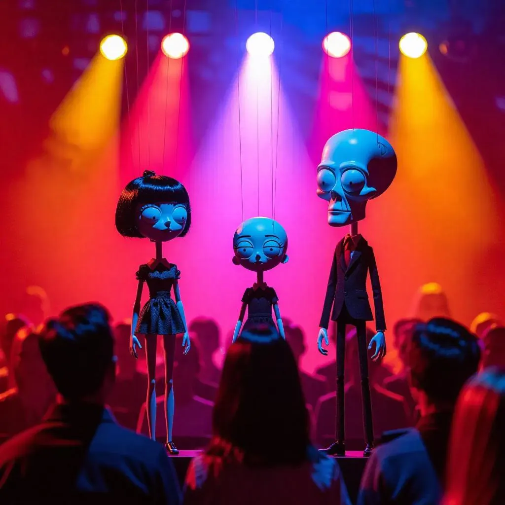 AI-generated surreal imagery brings Squidward Tentacles and Freddie Doll puppets to life on a brightly lit stage. Visible intricate wires enhance the eerie atmosphere. Craft haunting, puppet-driven scenes effortlessly with vivago.ai's AI effects and professional editing tools for captivating visual storytelling.