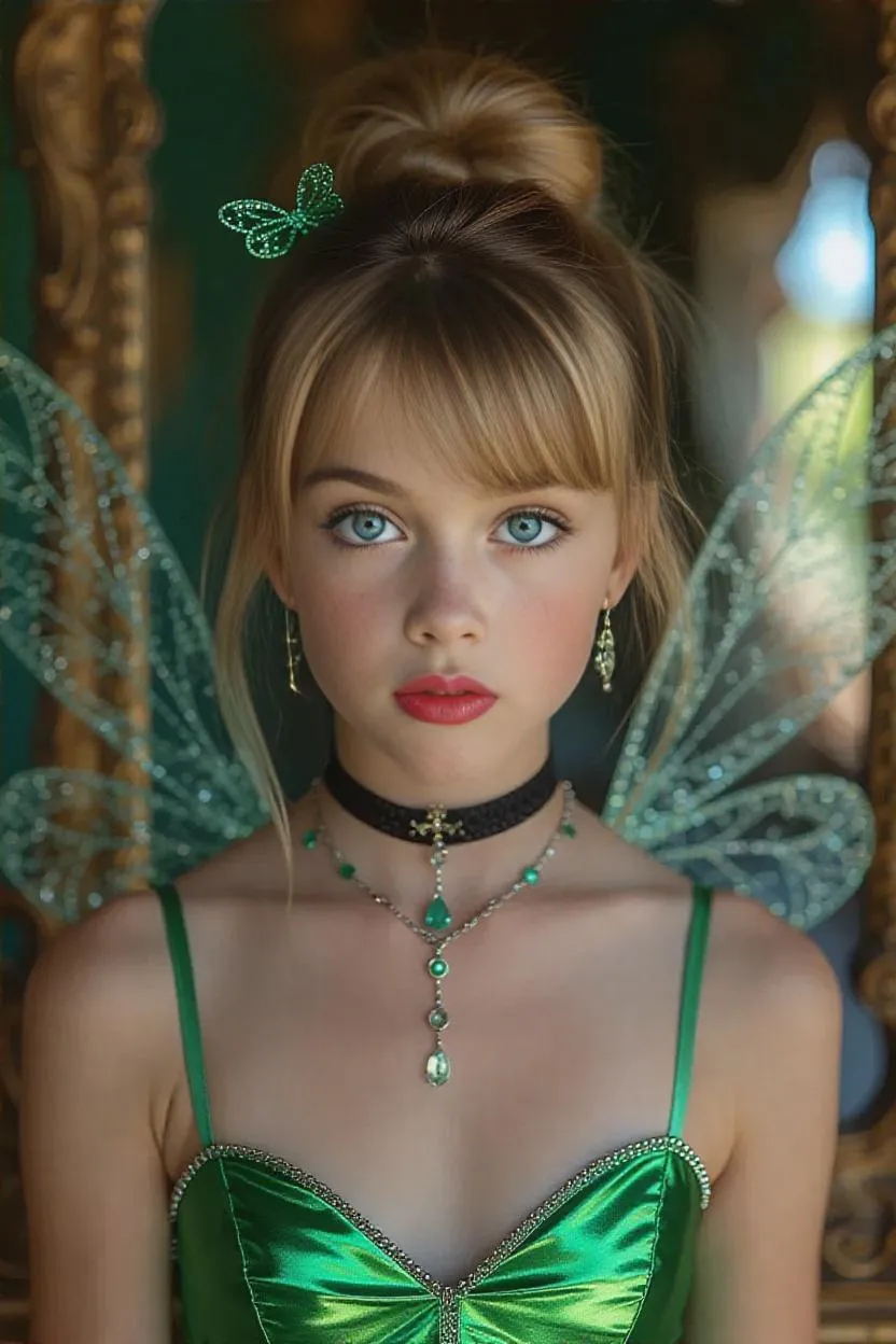 Transform text prompts into vivid AI visuals with vivago.ai. Create a Tinkerbell-inspired fantasy makeover: a pouty tween boy in full costume, blonde bun, bold makeup, diva pose at a Disneyland vanity. Explore AI-generated creative transformations, detailed imagery, and enchanting effects for professional-grade, whimsical content. Perfect for fantasy, cosplay, or unique character designs.