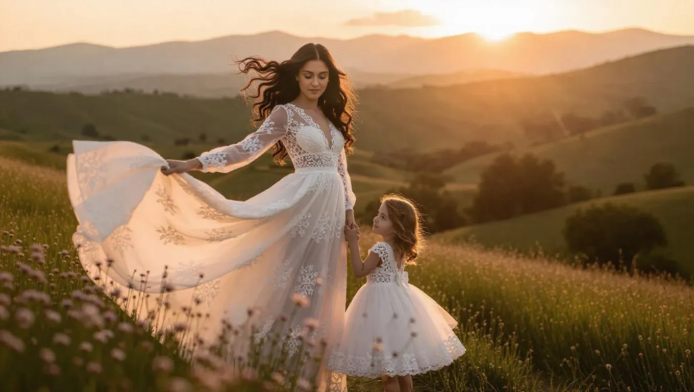 Create mesmerizing AI visuals of a woman with voluminous long hair in a flowing white eyelet dress, accompanied by a girl in a matching gown, set against a breathtaking scenic backdrop. Vivago.ai crafts stunning, ethereal imagery through advanced AI effects and text-to-image precision for professional-grade creative projects.