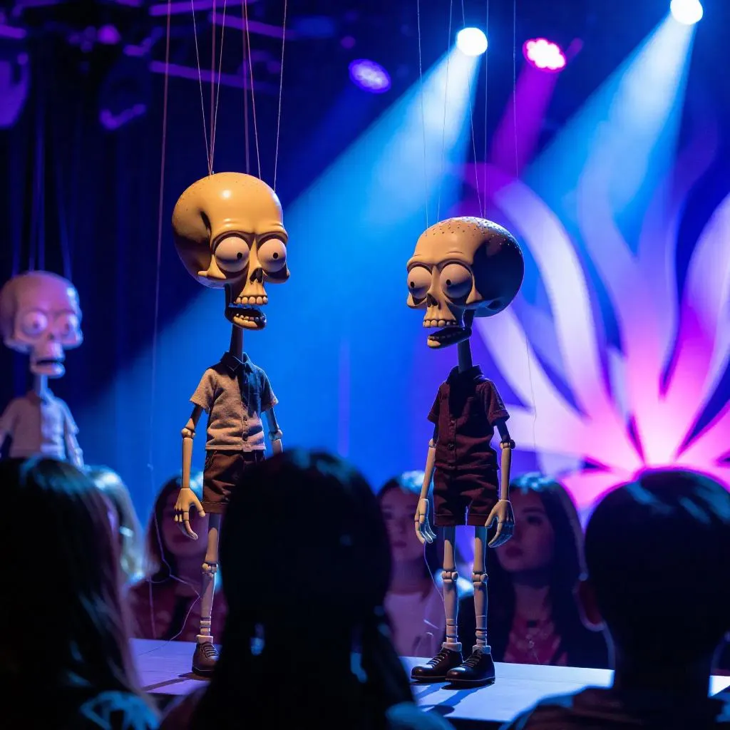 AI-generated surreal imagery brings Squidward Tentacles and Freddie Doll puppets to life on a brightly lit stage. Visible intricate wires enhance the eerie atmosphere. Craft haunting, puppet-driven scenes effortlessly with vivago.ai's AI effects and professional editing tools for captivating visual storytelling.