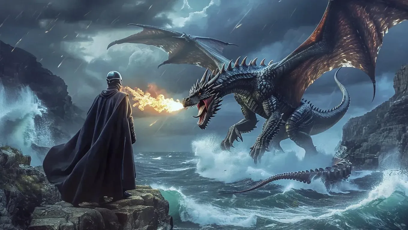 Create AI-generated art of a masked man in elegant attire overlooking a stormy ocean, witnessing a dragon vs giant octopus battle. Transform text prompts into surreal visuals with Vivago.ai's AI tools for dynamic, professional-grade fantasy scenes and epic creature clashes.