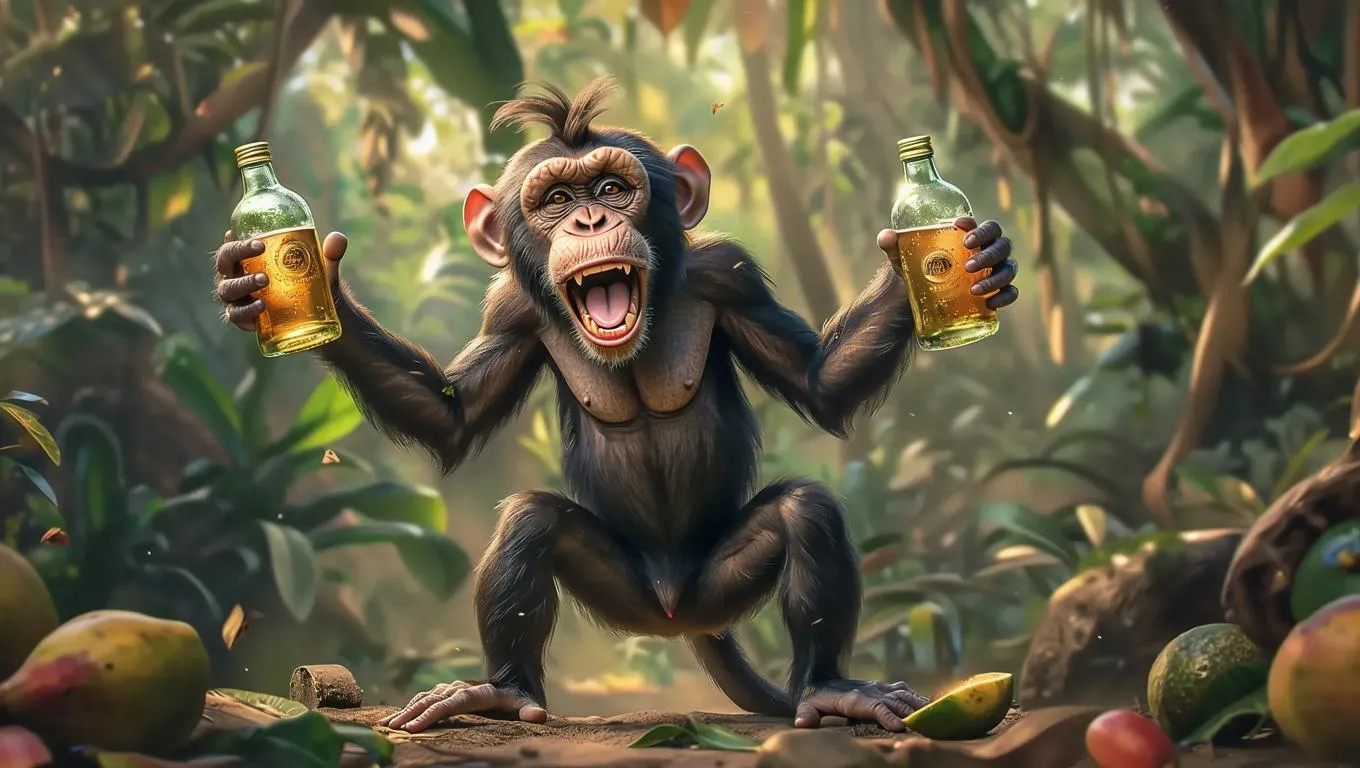 Generate comical tipsy monkey artwork with AI. Craft mischievous, intoxicated primates in chaotic jungle scenes—scattered fruits, upturned objects, wild expressions. Perfect for whimsical animal illustrations, humorous character designs, or lively nature-themed projects. VivaGO.ai transforms prompts into vivid, playful visuals with professional AI effects.