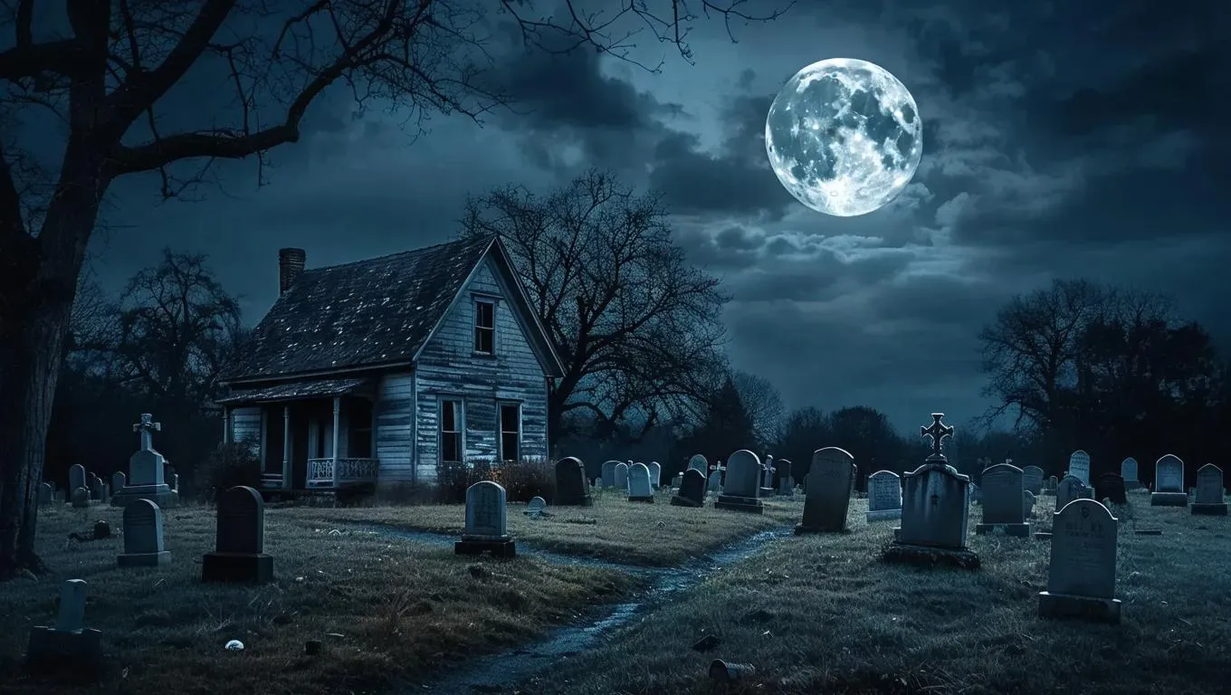 Generate a spooky AI-generated image of a haunting graveyard under a glowing full moon, featuring a mysterious small house on the left. Perfect for horror themes, Halloween visuals, or eerie storytelling. Transform text prompts into spine-chilling scenes with Vivago.ai's AI effects and professional editing tools. Create haunting visuals with ease.