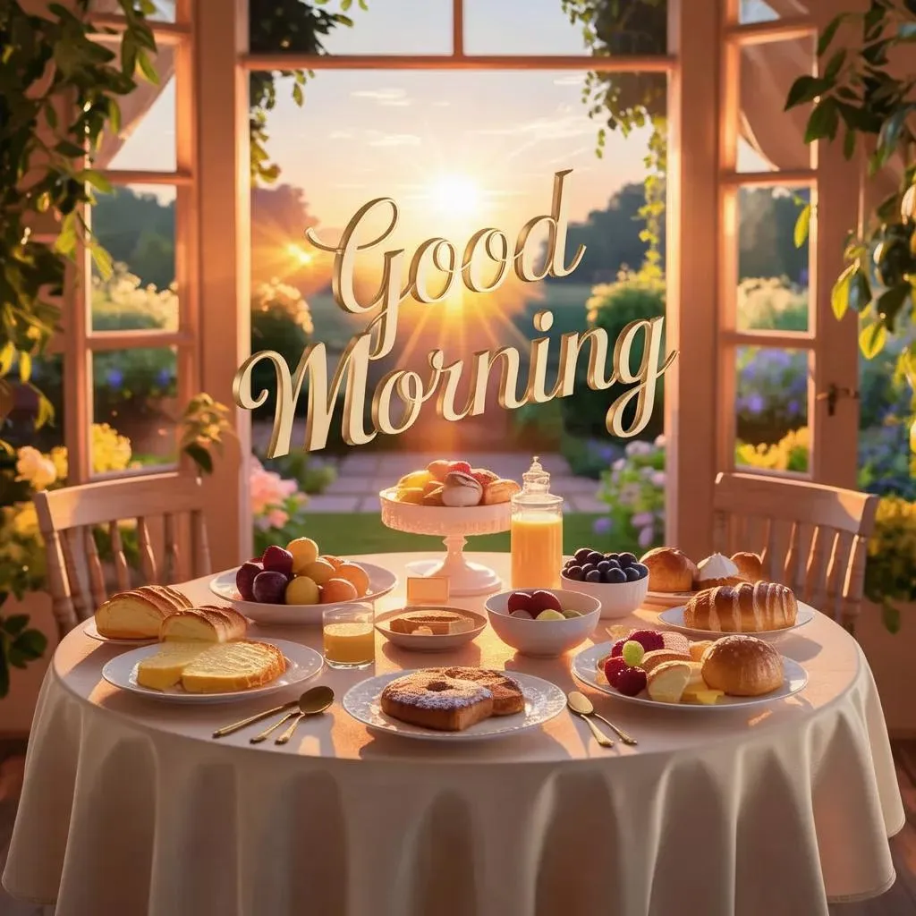 Generate a vibrant AI morning scene with a beautifully set breakfast table featuring fresh pastries, fruits, and floral accents. Add dynamic 3D text "Good Morning" for a cheerful touch. Perfect for social media, greeting cards, or daily inspiration. Explore vivago.ai's AI image generator for customizable, photorealistic visuals and creative effects.