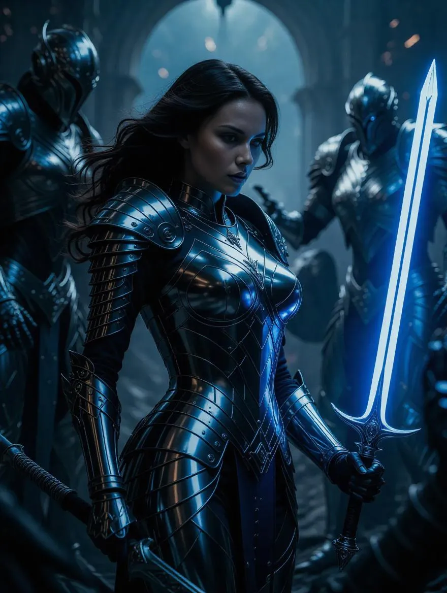 Generate epic AI fantasy art with VivaGo.ai: a radiant woman warrior clad in glistening Armor of Light clashes against darkness. Blend Romanticism's drama, Futuristic Style, and heroic fantasy visuals using AI tools for striking, ethereal battle scenes. Craft luminous, otherworldly narratives effortlessly.