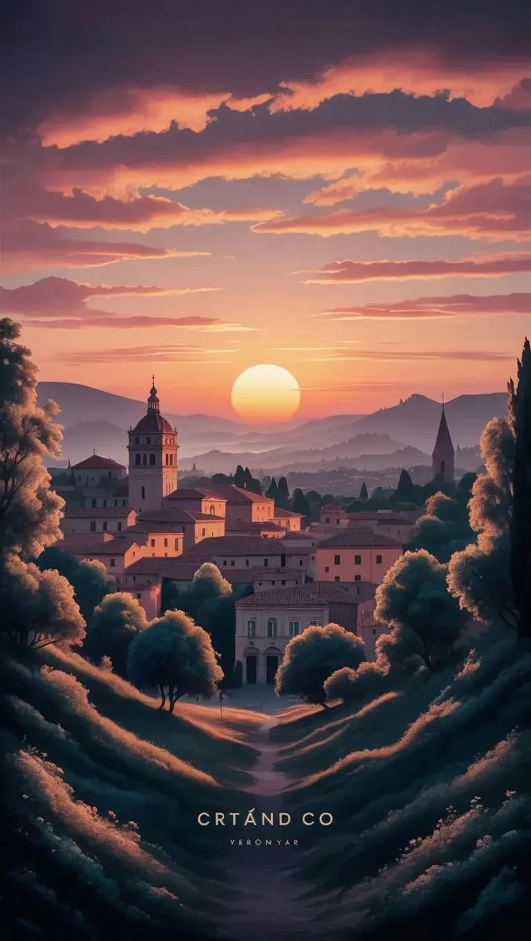 Create a nostalgic sunset landscape with warm orange, pink, and purple hues using AI. Generate serene horizons featuring silhouetted ancient buildings and trees for evocative visuals. Perfect for crafting dreamy, professional-grade scenes with Vivago.ai's creative tools.