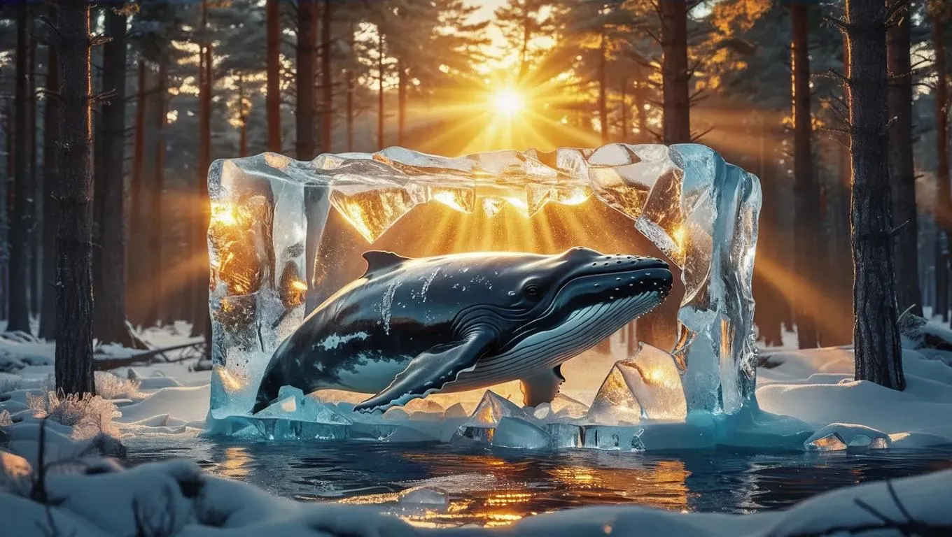Craft AI-generated images of a translucent ice block shattered into fragments, sunlight filtering through in a vibrant forest with golden pine trees. Discover a realistic frozen whale encased within the icy sculpture using Vivago.ai's advanced AI tools for mesmerizing, hyper-detailed visual creations.