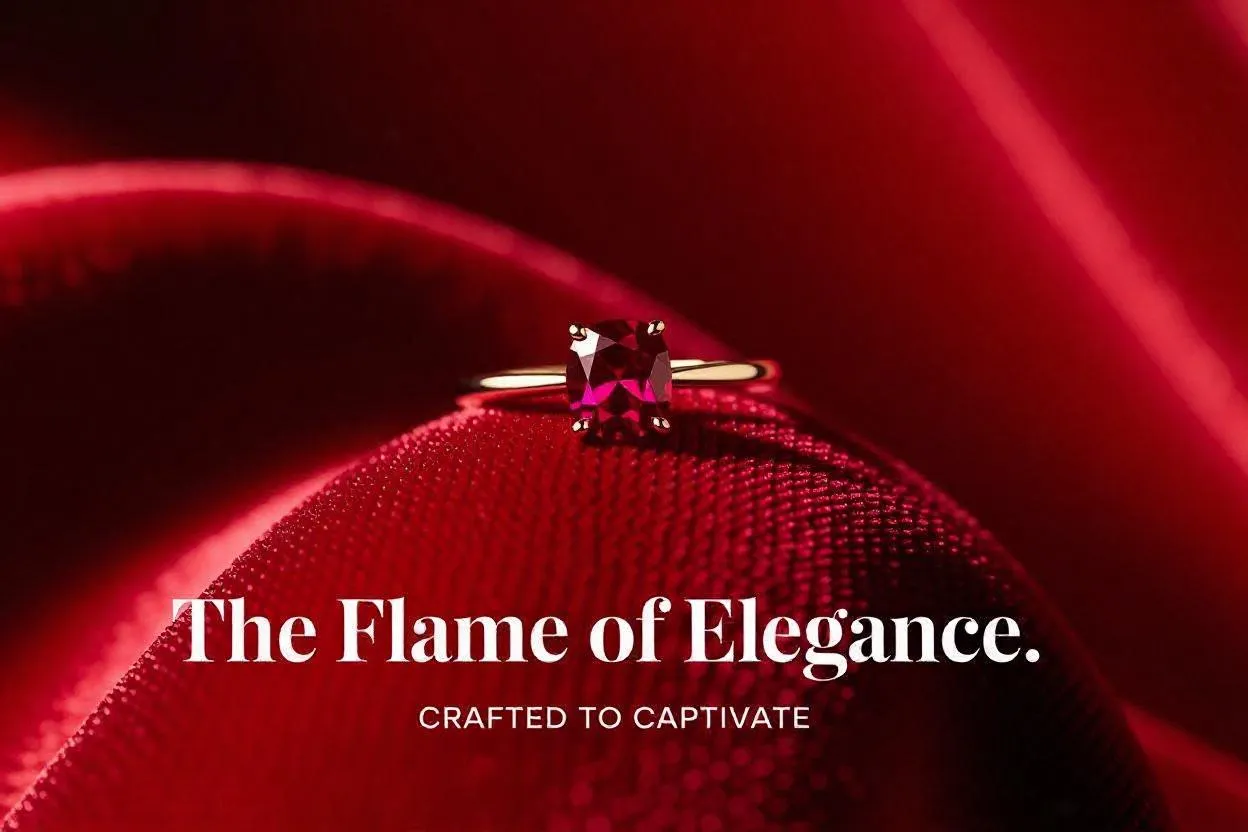 Craft captivating luxury jewelry visuals with AI-generated high-end product photography. Showcase an elegant gold ring with vivid ruby gemstone on red velvet backdrop, soft natural lighting, clean minimalist composition. Features bold "The Flame of Elegance" and thin "Crafted to Captivate" serif typography for premium sophistication. Generate professional-grade jewelry visuals effortlessly.
