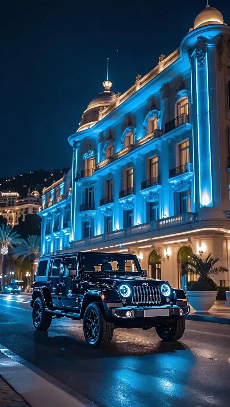 Transform your vision into striking visuals with vivago.ai's AI image generator. Craft a sleek Black Thar SUV parked outside a luxury Monte Carlo hotel, bathed in vibrant blue neon lights at night. Ideal for automotive and travel content, delivering professional-grade, cinematic results.