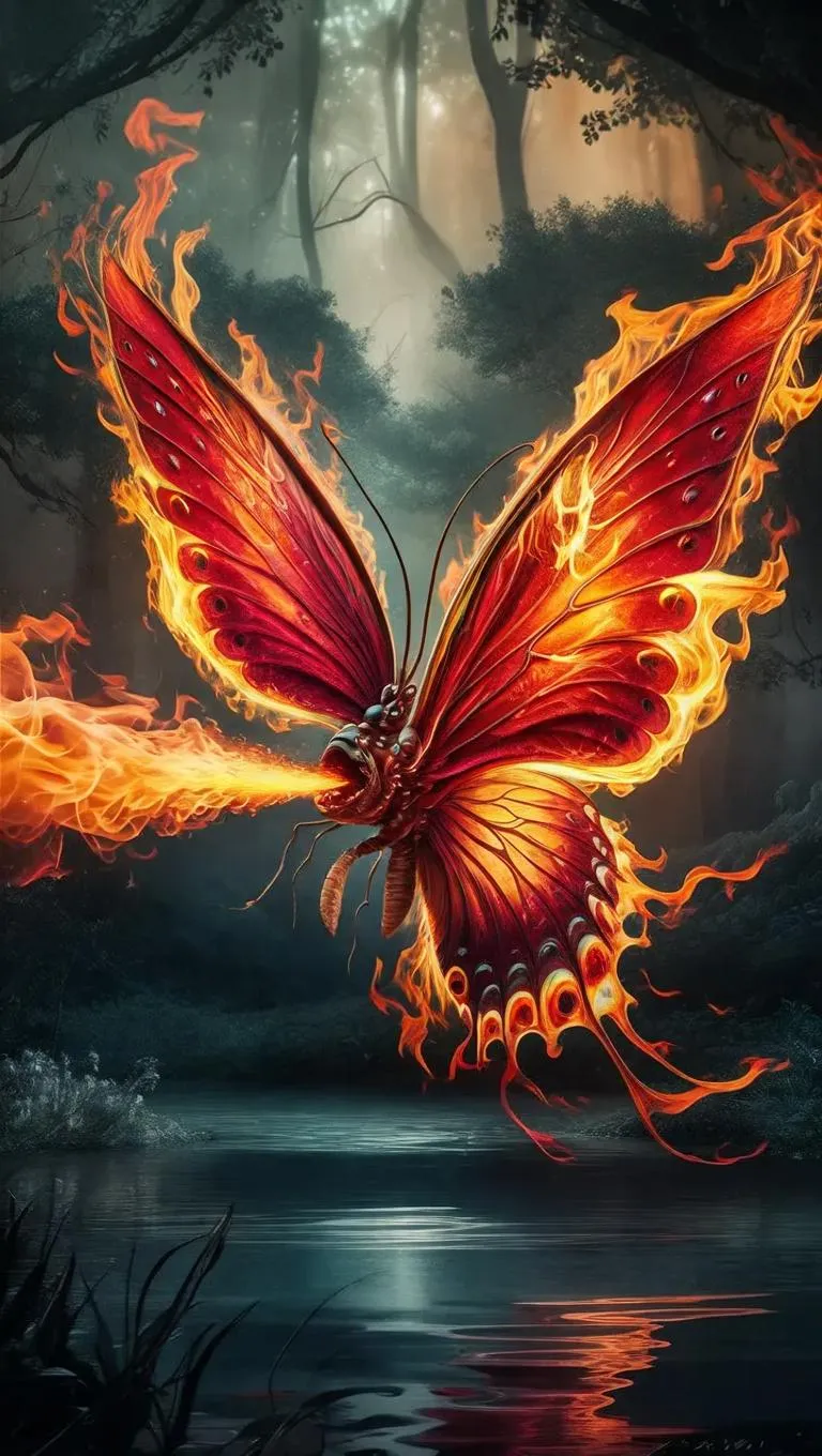 Generate a magical fire-breathing butterfly with vivid red and orange hues using AI. This surreal fantasy art combines delicate butterfly beauty with fiery power, set against a serene blurred forest backdrop. Vivago.ai’s AI tools create stunning, dynamic visuals from text prompts for professional-grade, imaginative results.