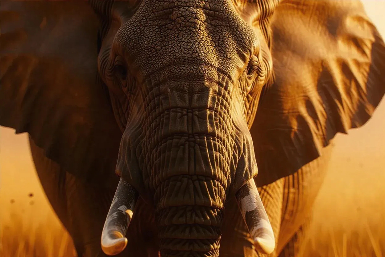 Ultra detailed 4K photorealistic African elephant in golden savanna light Wrinkled, dusty skin with cracks and folds, long eyelashes, fine dust particles in air, textured ivory tusks.