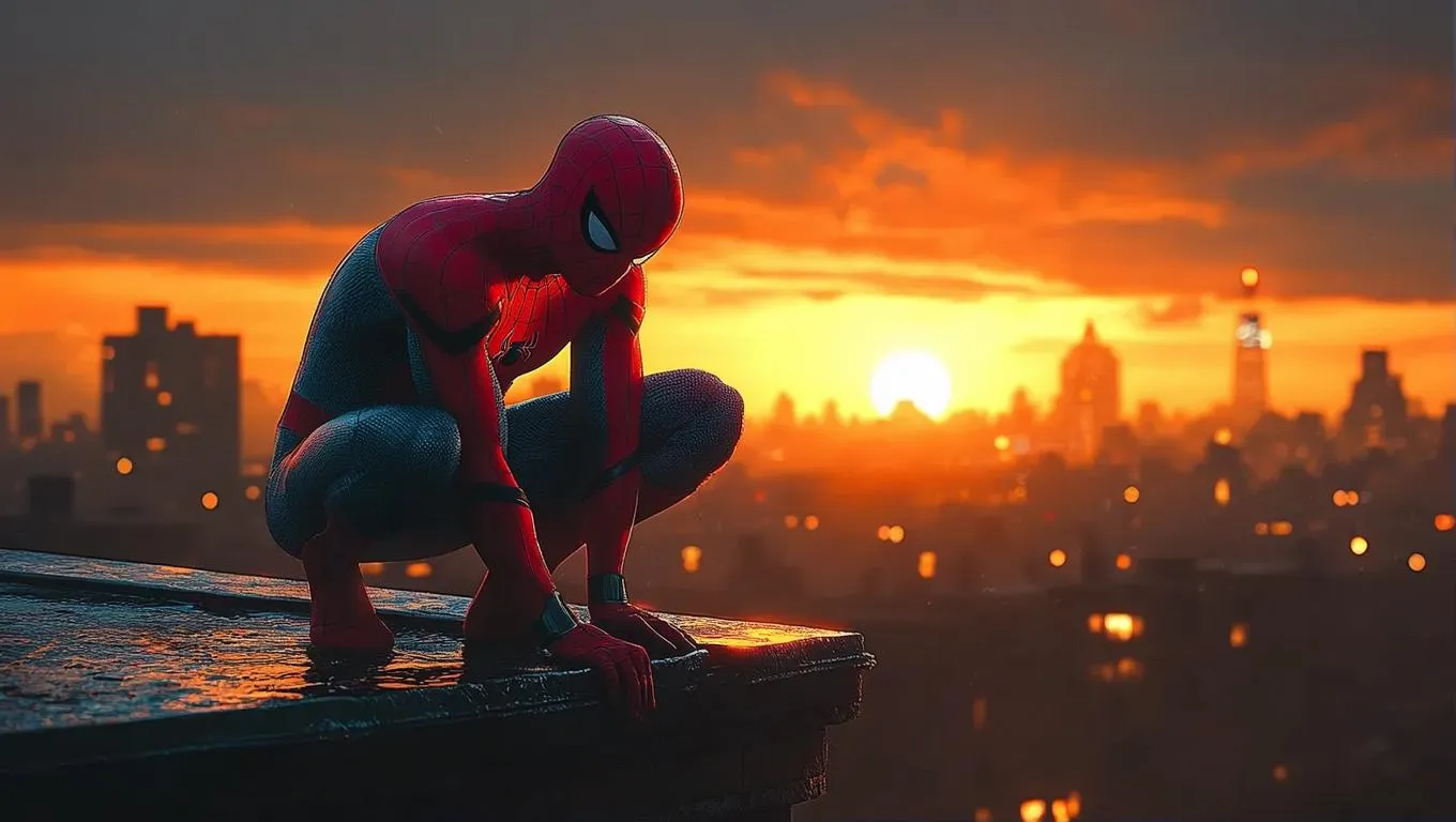 Generate a realistic AI image of Spider-Man at dawn: detailed superhero art capturing a weary yet hopeful mood. Soft sunrise lighting illuminates his slumped silhouette on a damp rooftop, city lights flickering below. Perfect for bittersweet superhero visuals, blending exhaustion with the promise of a new day.