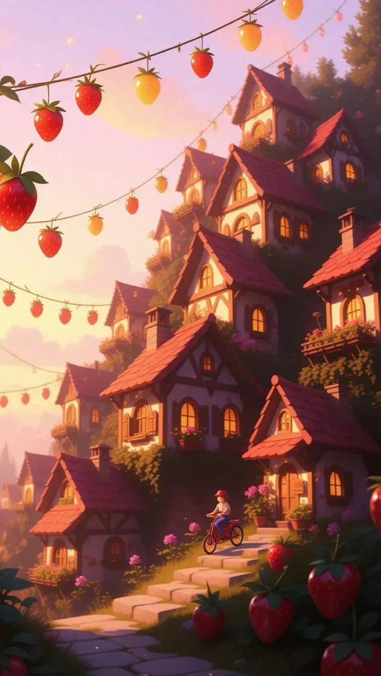 Create Studio Ghibli-inspired AI art of Strawberry Lantern Town at dusk: whimsical strawberry houses, glowing vine lanterns, and anime-style kids on cherry tricycles. Watercolor textures meet nostalgic lighting with minimalist brushstroke skies, twinkling firefly lights, and soft peach-lilac hues. Generate nostalgic, magical scenes blending color pencil details and AI creativity at Vivago.ai.