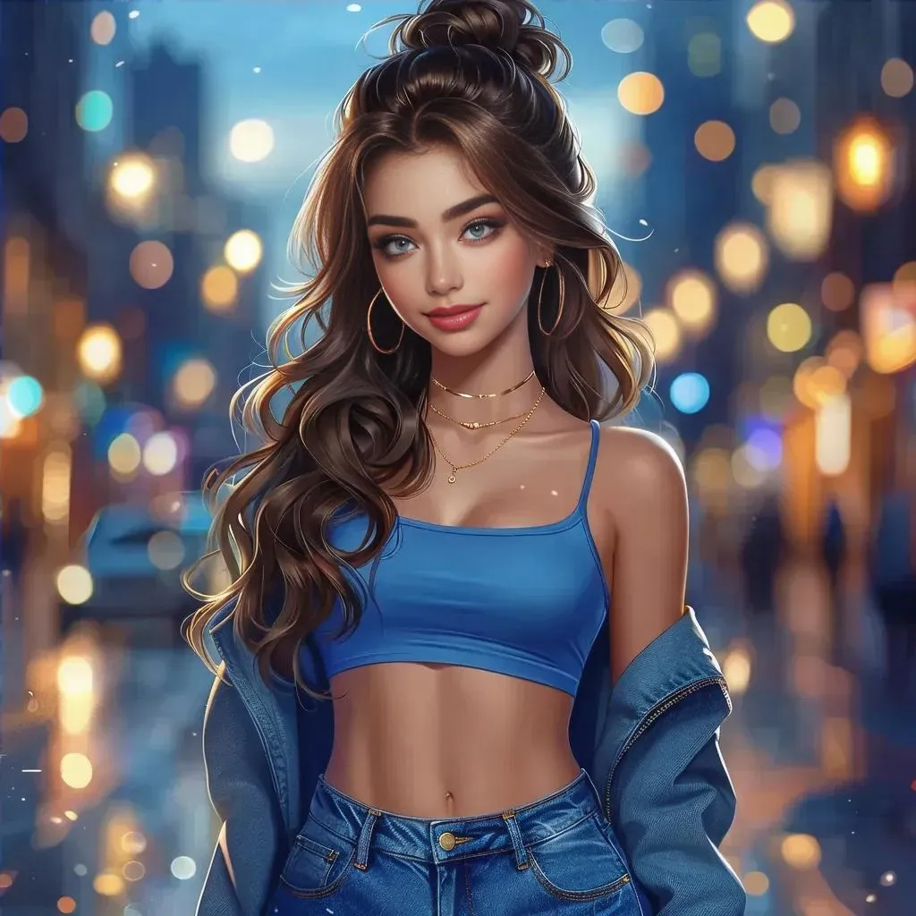 Ultra-high definition AI-generated image of a confident young woman with blue eyes, side bun hairstyle, and sweet-style trendy crop top. Set in a chic urban dusk backdrop with blurred city lights, showcasing flawless skin, delicate gold jewelry, and ultra-realistic details. Perfect for AI art, fashion inspiration, and high-quality portrait generation tools.