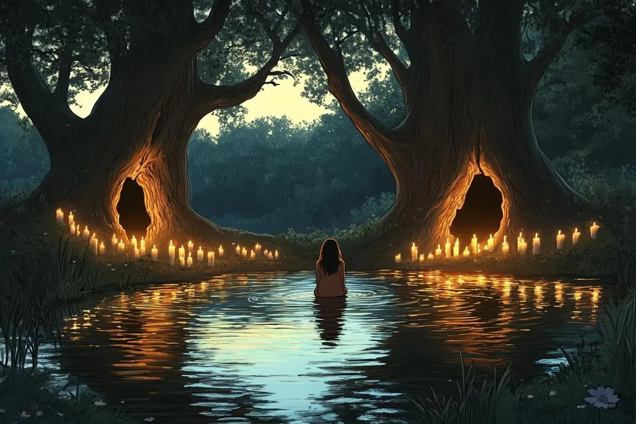 Transform text into AI-generated anime art with vivago.ai. Craft serene ponds reflecting nostalgic scenes, hollow candlelit trees, and a traveler's introspective moment. Watercolor visuals merge with cinematic style (3:2 aspect ratio) for professional-grade imagery. Ideal for evocative storytelling through AI-powered creativity.