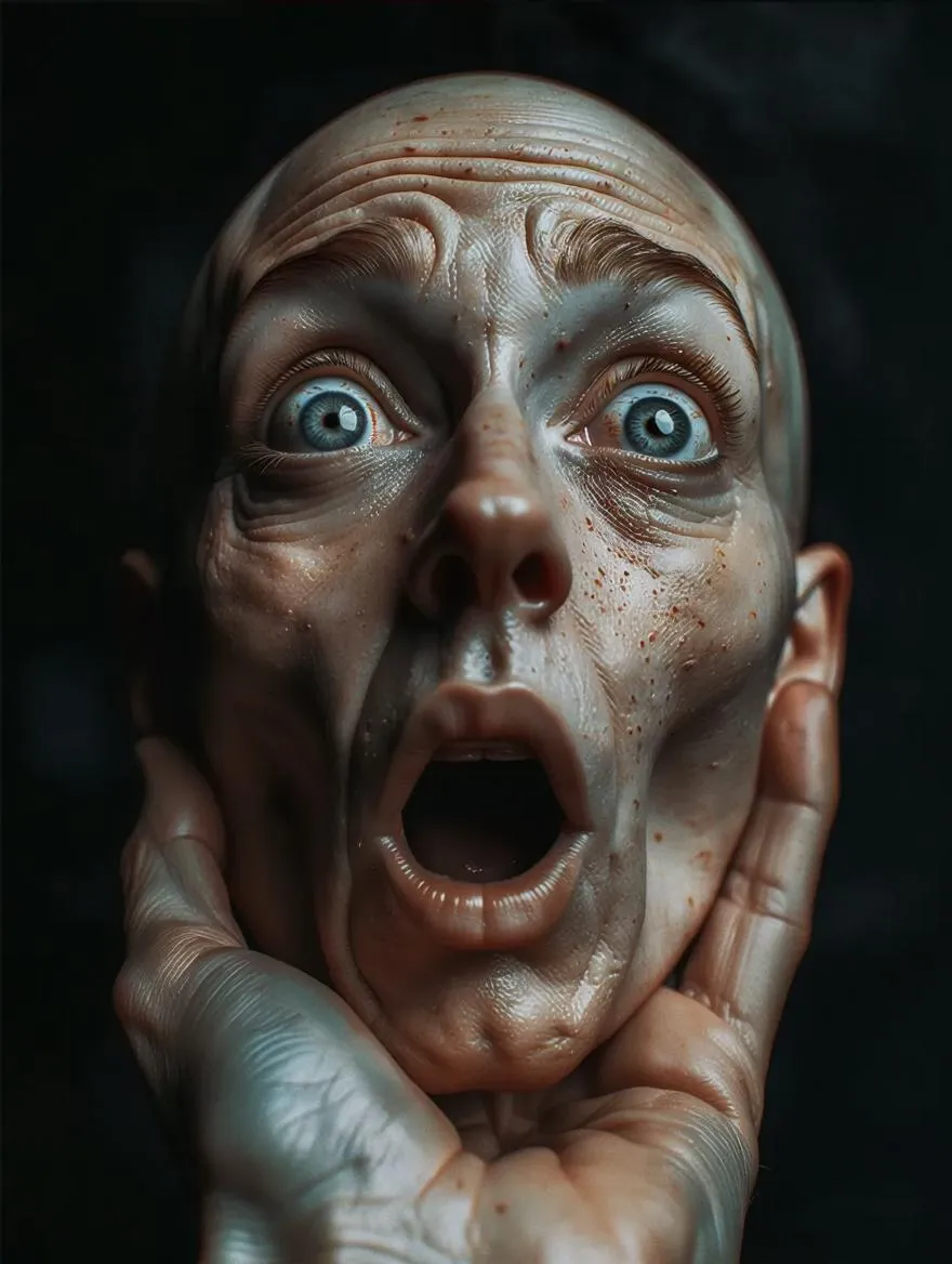 a hand in the foreground holds a human head with a surprised expression. hyper realistic and ultra detailed