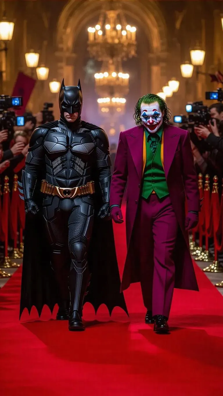 Generate a striking cinematic scene of Batman and Joker on a glamorous red carpet using AI-powered tools. Contrast their iconic expressions — stoic hero vs. chaotic villain — amid flashing cameras, dramatic lighting, and roaring crowds. Create high-detail, stylish visuals with vivago.ai's AI image generator and cinematic effects for professional-grade, viral-worthy content.