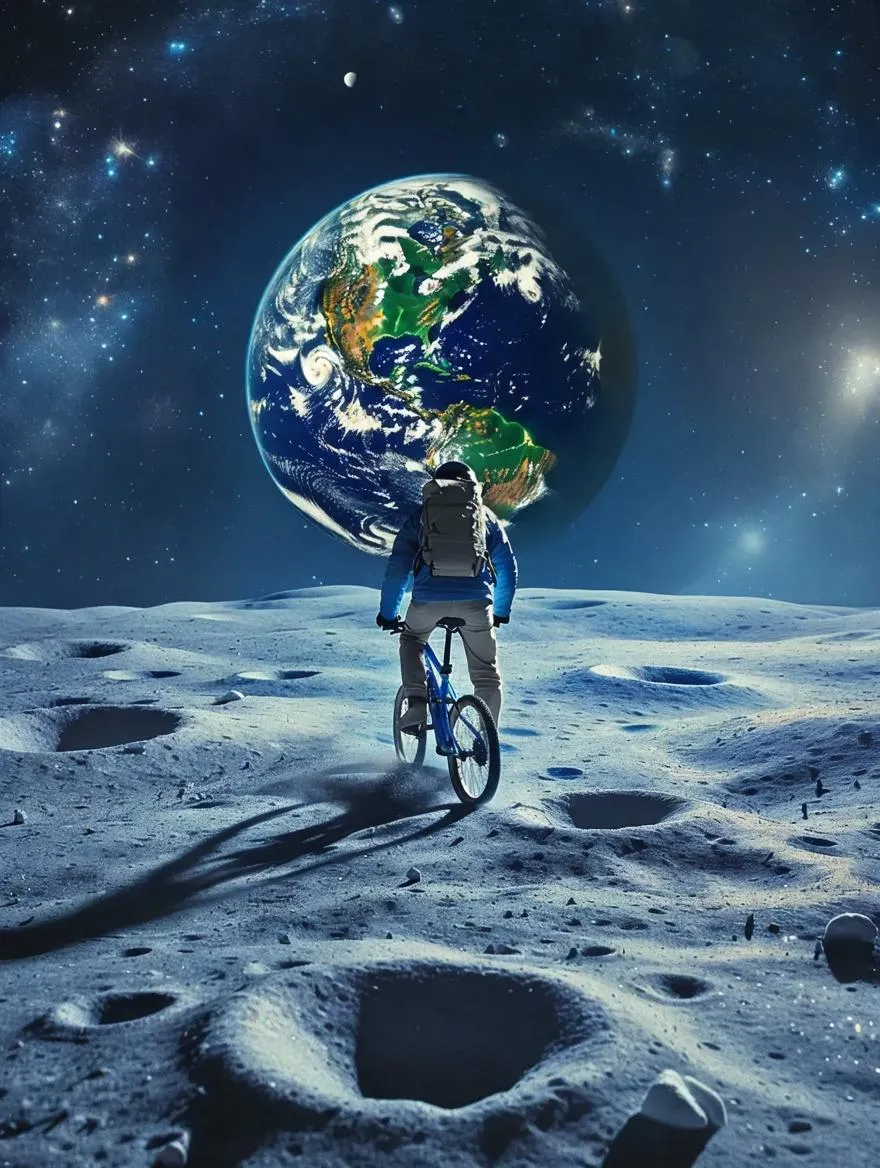 AI-generated image of a surreal moon bike ride with Earth backdrop. Explore futuristic space scenes using AI effects for vivid lunar landscapes, cosmic lighting, and hyper-realistic details. Perfect for sci-fi visuals, creative projects, and digital art. Transform prompts into high-quality, imaginative content with Vivago.ai's advanced AI tools.