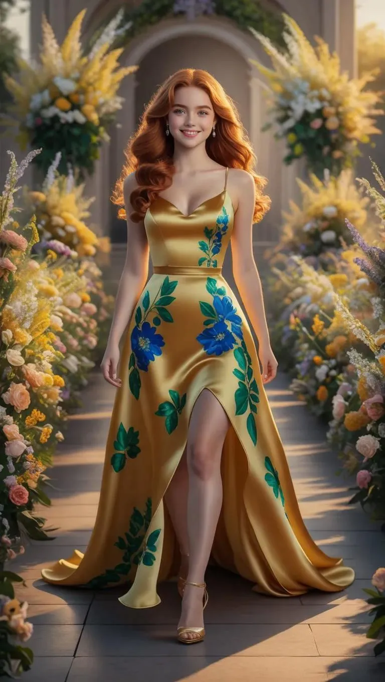 Capture golden hour's magic with this hyper-realistic AI-generated portrait: A curvy Irish redhead model struts a mustard yellow silk dress with royal blue florals on a flower-filled runway square. Photorealistic details showcase emerald leaf patterns, radiant complexion, and dynamic lighting in 32K UHD perfection. Masterpiece-quality AI fashion imagery blending natural beauty with vibrant haute couture aesthetics.
