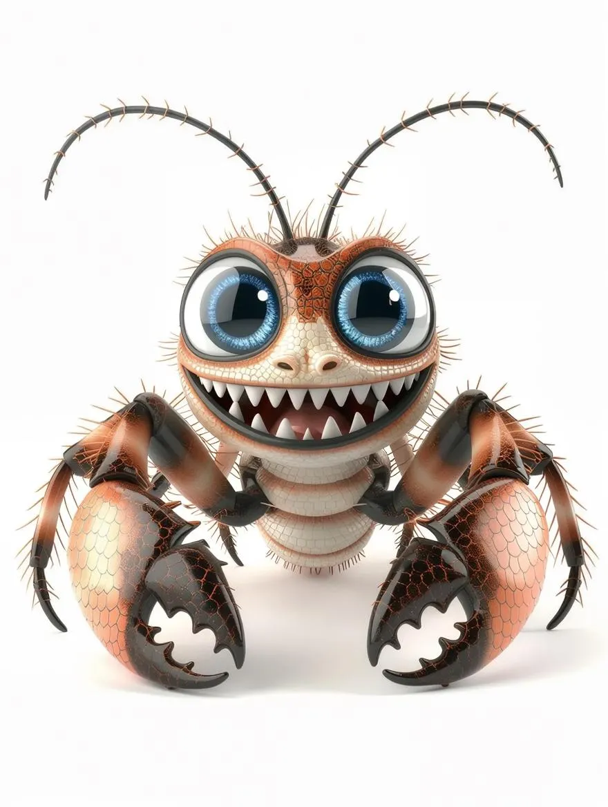 A cartoon-style scorpion with a vibrant peach-colored body, gradating to a soft cream tone towards the edges, is positioned in the center of a pristine white background. The scorpion's dark brown claws and tail are intricately detailed, with textured, scaly patterns that catch the light, giving them a lifelike appearance. Large, expressive blue eyes dominate the scorpion's face, featuring black pupils that seem to sparkle with mischief and white highlights that add a touch of brightness. Two small, delicate antennae-like protrusions sprout from the scorpion's head, adding to its endearing and whimsical nature. A wide, toothy grin spreads across the scorpion's face, with its mouth open in a joyful expression, revealing a pink tongue that curls up in a friendly smile. The scorpion's body is segmented, with each segment showcasing a slight sheen, as if it has been polished to a high gloss. The overall style is reminiscent of classic cartoons, with bold lines, bright colors, and a sense of