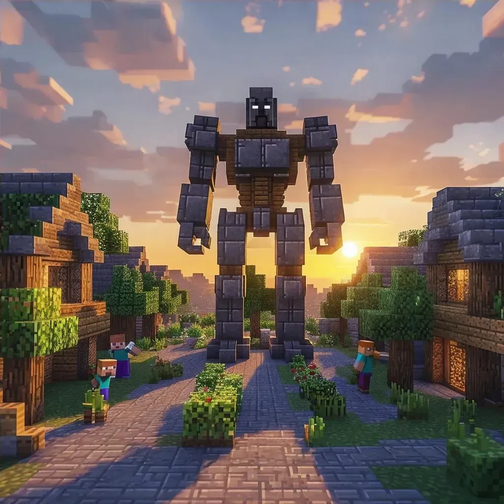Create immersive Minecraft village scenes with AI-generated iron golem statues at their heart. Transform text prompts into blocky landscapes, pixel-art structures, and iconic mob designs using vivago.ai's AI image tools for gaming visuals, concept art, or custom map-building projects.