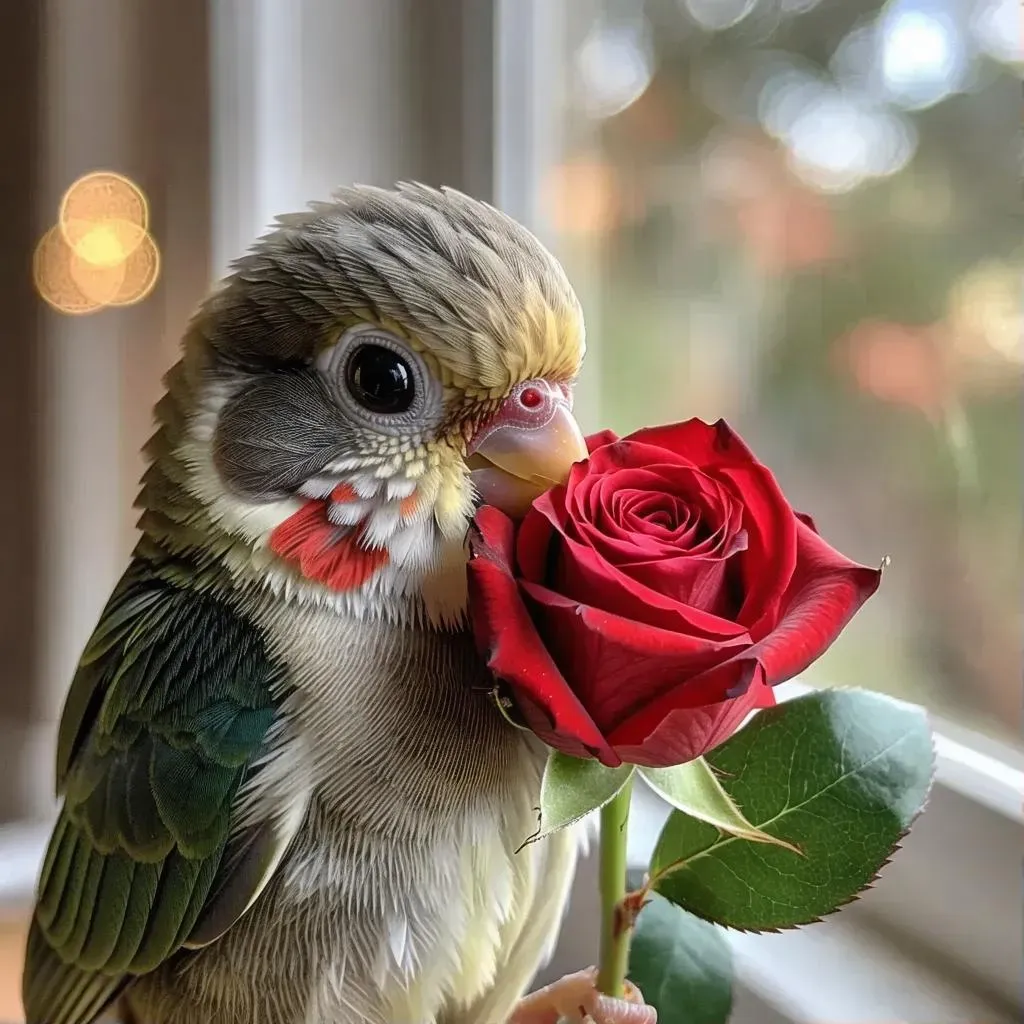 Create a heartwarming AI-generated image of a realistic love bird in HD, holding a red rose in its beak against a soft-blurred home background. Perfect for romantic themes, greeting cards, or personalized gifts. Explore AI-powered visual storytelling with vivid details and emotional charm at VivaGo.ai.