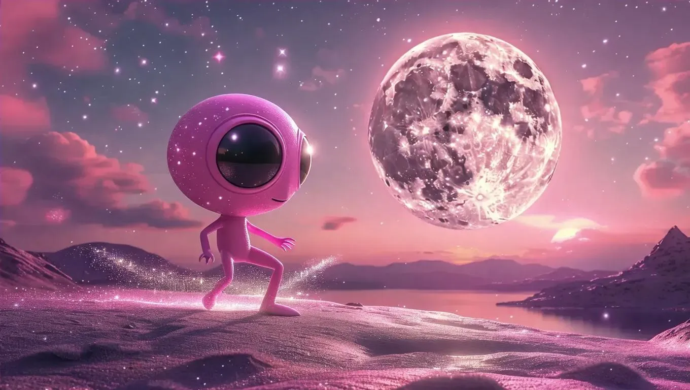 Transform your ideas into surreal space art with Vivago.ai. Generate a whimsical moon scene featuring a pink alien using AI-powered tools. Create customizable, professional-grade sci-fi visuals from text prompts for unique, eye-catching digital content.