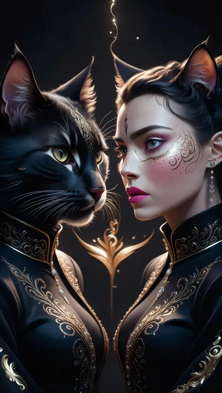 Create a surreal AI-generated image of a mysterious feline-human hybrid with ultra-high resolution 16k detail. Featuring striking matching eyes, intricate fur patterns, and soft diffused lighting against a black backdrop for professional-grade visual impact. Ideal for artistic projects and digital content creation.