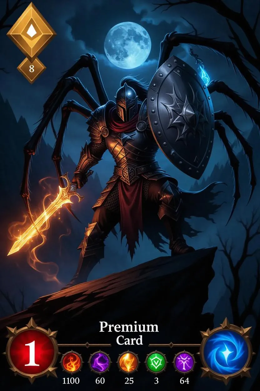 A heroic warrior, battling a giant spider, showcasing a Premium Card Game card in fantasy horror style, with the warrior wielding a glowing sword and shield emblazoned with a silver emblem, standing on a dark, misty mountain peak, surrounded by twisted trees, with a full moon rising behind, casting eerie shadows, rarity symbol shining bright gold at the top, faction symbol a bold, red crest on the warrior's chest, mana cost displayed prominently in the bottom left corner, energy cost pulsating with a blue glow at the bottom right, as fog swirls around the warrior's ankles.
