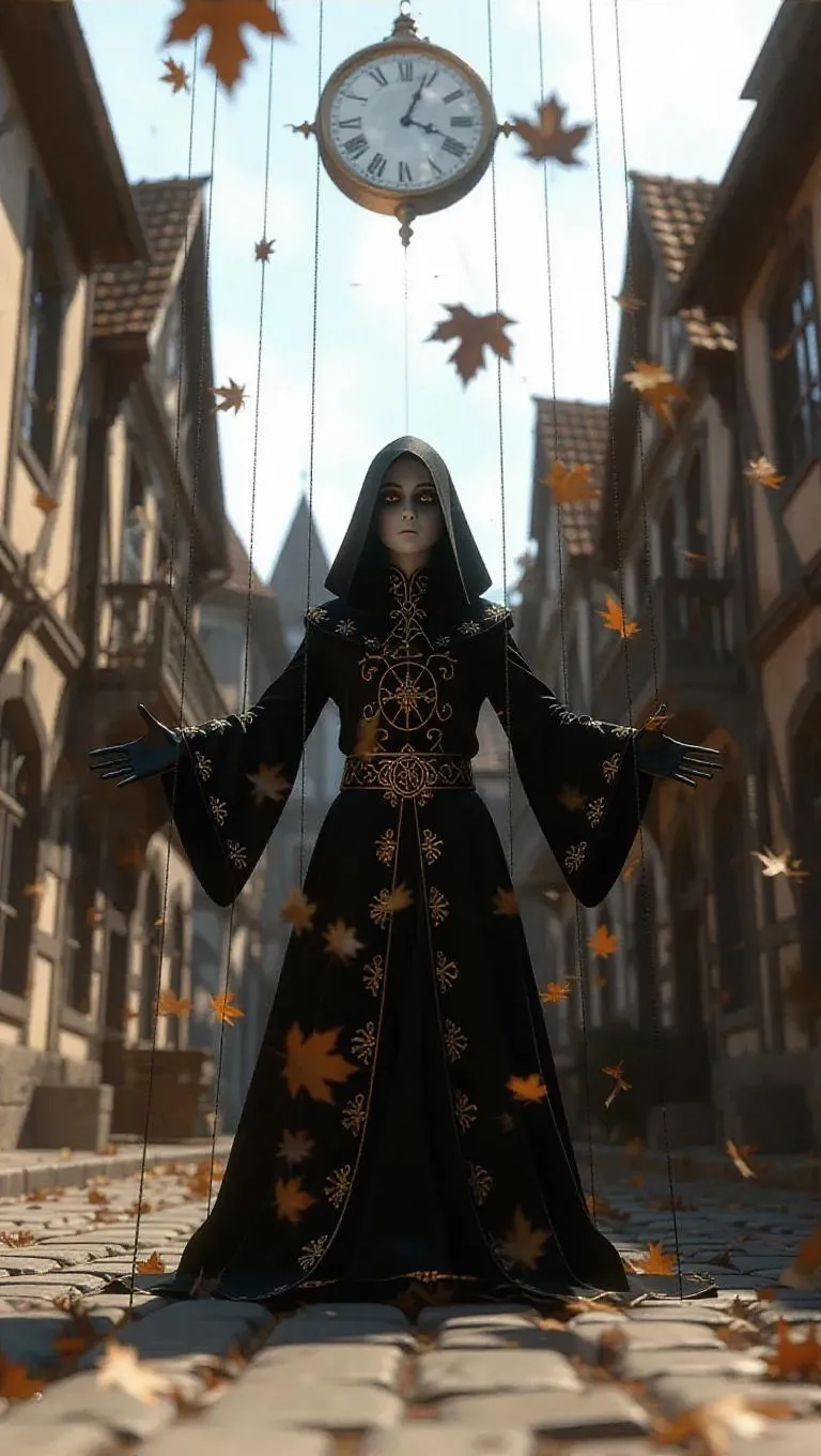 Experience AI-generated surreal puppet scenes with VivaGo's tools. This hyper-realistic CG artwork depicts a marionette controlling a time-frozen town, rendered in muted tones with stone textures, suspended leaves, and dramatic shadows. Octane-powered details highlight intricate符文 robes and静止 architecture. Avoid vibrant colors or motion blur for maximum神秘 atmosphere. Optimize AI visuals via precise材质 controls and顶光 settings.