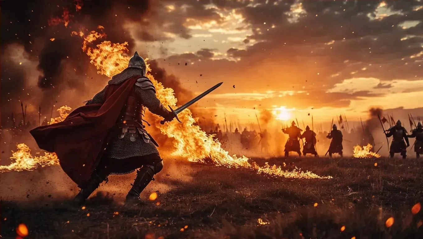 Create epic battle scenes with AI! Generate a warrior charging across a fiery sunset battlefield, explosions blazing, dust swirling, and embers glowing. Perfect for dynamic combat visuals, dramatic low-angle shots, and intense cinematic imagery. Craft vivid, dramatic art with Vivago.ai's AI image generator for action-packed, high-energy storytelling.