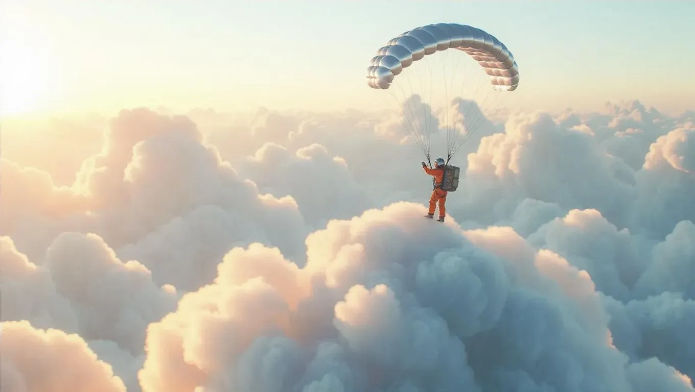 Lurching precariously on the wispy crest of a cumulus cloud, a diminutive man in a bright orange jumpsuit clings to the downy peak, his tiny hands grasping a fluttering silver parachute as iridescent cloud tendrils swirl around him, with sunlight dancing across his miniature features in an eerie, dreamlike tableau, rendered in hyper-realistic detail, evoking a sense of whimsical, surrealist fantasy.