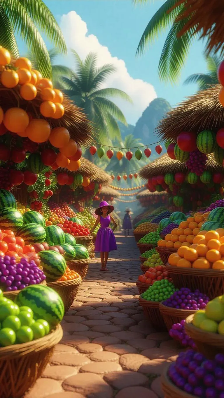 Vibrant AI-generated fruit bazaar in ultra-HD CG style. Features coconut-durian stalls, carved watermelons, animated fruit vendors, and warm-lit ambiance. Ideal for dynamic digital art, colorful marketplace visuals, and lively fruit-themed storytelling with detailed characters and warm atmospheres.