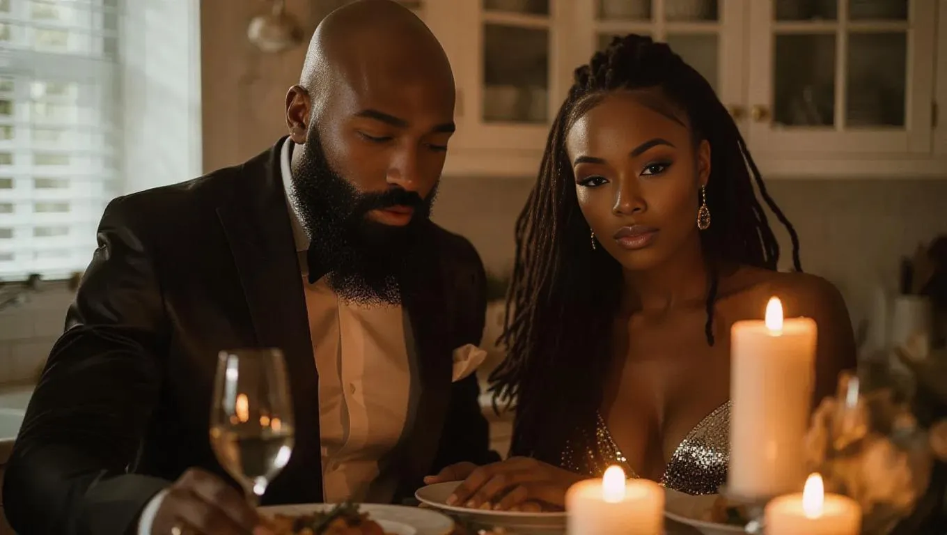 Create AI-generated visuals of a romantic candlelight dinner scene with a bald Black man in a silk suit playfully sneaking up on his wife, adorned in long dreadlocks, cooking. Perfect for love-themed AI art, couple scenarios, and creative storytelling via text-to-image AI tools.