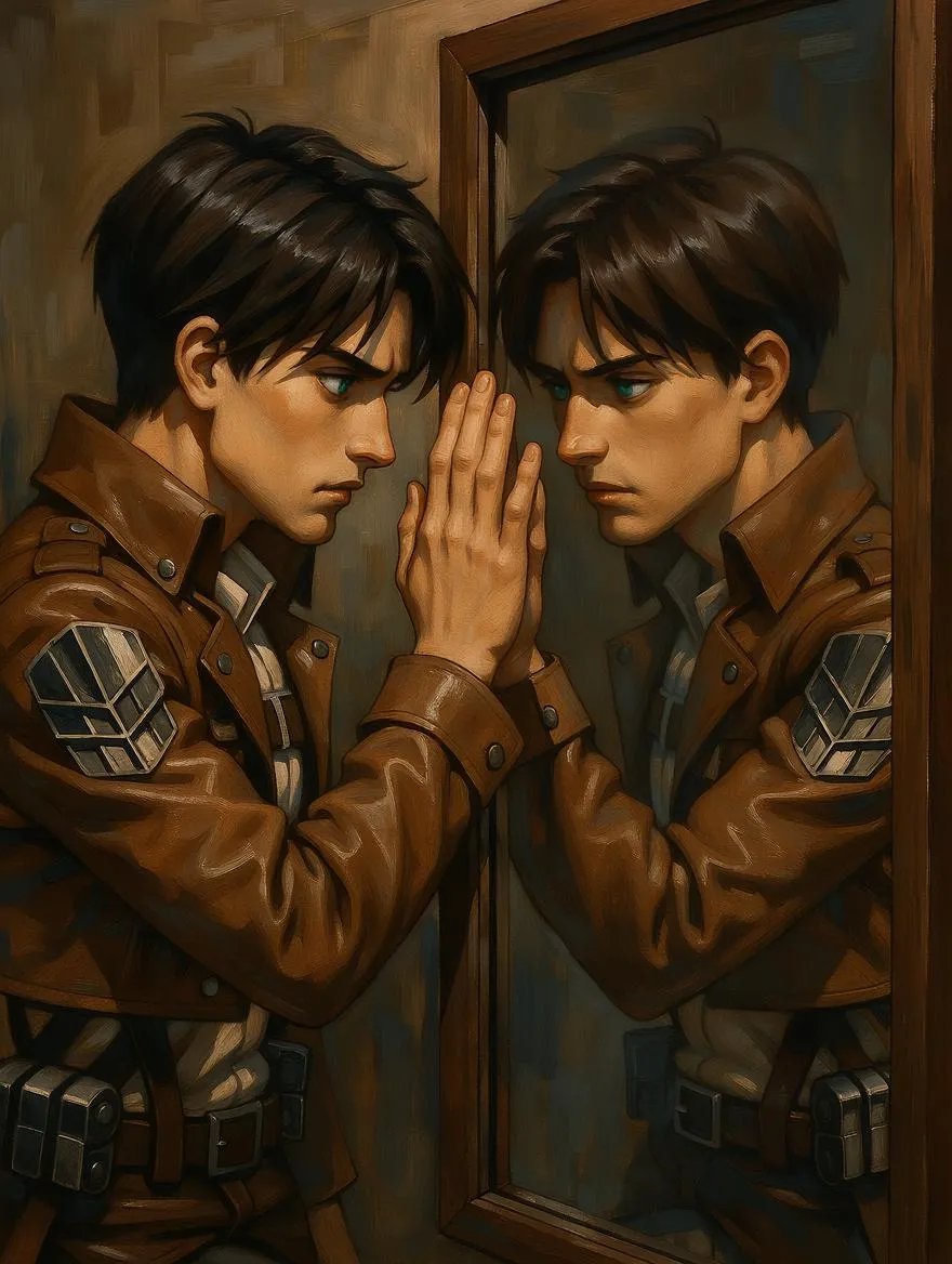 Generate surreal thick-painted Attack on Titan art with vivago.ai. Create AI images of Eren Yeager in a psychological mirror duel, showcasing dark symmetry and dual personalities for eerie psychological horror. Experience professional AI effects for shocking, reflective illustrations.